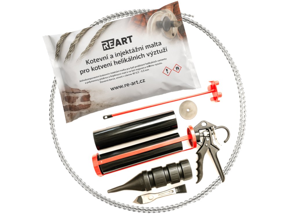 Aplikační sada pro zajištění trhlin ve zdivu, 10 m helikální výztuže 8 mm s aplikační pistolí a maltou.
